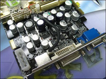 接口方面,提供了完整的TV-OUT、DVI、VGA接口,也是方便在各种场合下的不同应用。供电方面采用加强型供电设计,众多铝壳电容阵列,能提供稳定精确的供电,是显卡运行在高频下的保证,同时也为更进一步的超频打下了坚定的基础,还提供了一个外接4pin电源口来保证显卡的绝对供电。