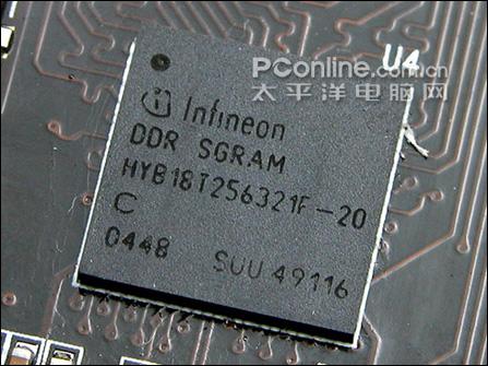 采用了原厂英飞凌GDDR3的显存,速度2ns,运行频率1000MHz,显存规格为128M/128bit。由于GDDR3电器性能良好,所以仍然存在着一定的超频空间。