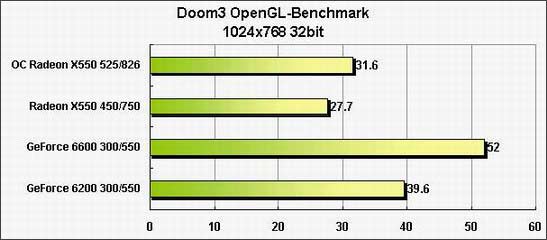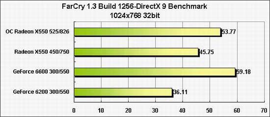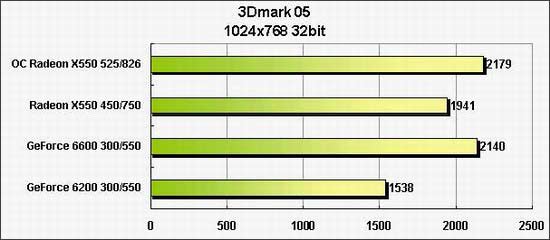 不难看出,超频后的X550性能较未超频时要高出不少,但与它同价位的GeForce 6200相比,除了采用OpenGL模式的Doom3稍有落后以外,在3Dmark和其它主流的大型3D游戏中,X550的优势都是十分明显的。从测试结果中可以看出,X550的性能介于GF6600和GF6200之间,但是在价格上,X550低于GF6600而与GF6200价格相近,看来,PCI-E显卡的中端低市场也许又将是下一个R9550:X550的天下。