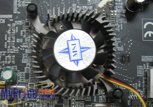 nForce4标板芯片上面,微星设计一个黑色散热风扇,为芯片提供主动散热。nForce4标准版单芯片内建了4个SATA接口,并支持RIAD功能,传输速率高达150MB/s,支持高达2G的HYperTransport,但是却不支持SATA2传输技术。