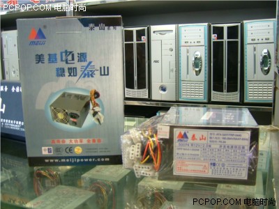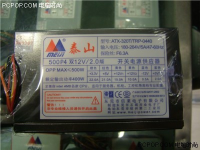 从铭牌上我们可以看到这款电源的额定功率为400W,最大功率更是达到550W!美基泰山电源符合的标准为Intel ATX 12V 2.0版标准,这也就是说这款电源具有两路12V的输出,可以满足现在电脑平台对+12V输出的需要。