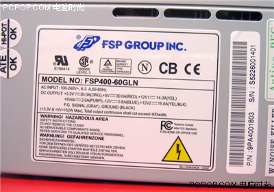 从电源的铭牌上可以看出,它的额定功率为400W,+3.3V输出电流为30A,+5V输出电流为30A,双路12V设计分别为+12V1输出电流为14A和+12V2输出电流为15A,在保护功能上具有过压保护、欠压保护、过载保护、过电流保护和短路保护,安全性也十分过硬。