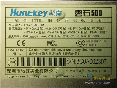 外观方面,磐石500的包装非常的大,比普通电源包装足足长了一倍。在电源的铭牌上,我们可以看出磐石500的输出功率可以达到400W,最大功率500W,足可以应付主流服务器的功耗,就是面对当前个人高负载的需求,它也是可以应付的了。而且提供的接头非常多,有12个四芯接口,支持12个硬盘设备是没有问题的。
