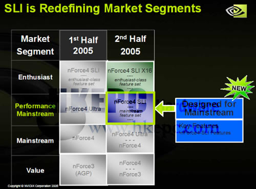 在2005年下半年,nVidia将会在晶片组产品线上从前定位,以往nForce 4 SLi是nVidia晶片组的最高级的产品,将会空降至高效能主流市场取代以往nForece 4 Ultra的位置,此举是nVidia希望把SLi技术进一步普及,我们不难从nVidia进一步开放较低阶的Geforce 6600及Geforce 6600LE也支援SLi中看到,SLi技术再不是有钱人的玩意。而原本最高级的产品将会由新一代nForce 4 SLi X16所代替,究竟nForce 4 SLi X16是什么来的?和现时nForce 4 SLi有什么不同呢?