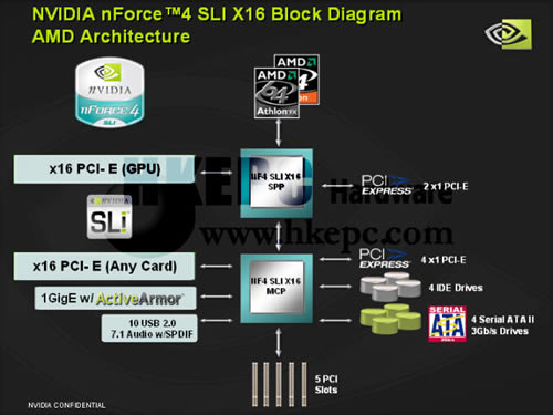其实SLi X16也不算什么新鲜产品,nVidia早在Workstation/Server级平台上已提供双x16 PCI-E的晶片组,它们就是nForce Professional 2200 + 2050,由于两颗晶片内各自内建PCI-E x16接口,因此能达成双X16 SLi架构,不过nForce Professional 2200 + 2050并不是全为SLi而生,提供双PCI-E x16很大程度上是为了日后伺服器级的PCI-E卡例如RAID卡等提供更充裕的扩充能力,加上专业级晶片组价钱昂贵,一般玩家根本不能负担。而nForce 4 SLi X16则是真正为SLi玩家而设,从图中的晶片组架构图可以看到双x16并不是单一晶片所组成,而是透过南桥和北桥各自拥有一组PCI-E x16,设计大致上和nForce Professional 2200 + 2050相同。