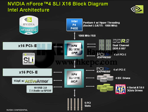 而在Intel晶片组方面北桥晶片同样为C19,它内建20 PCI-E Lanes能组成1组PCI-E x16及四组PCI-E x1,支援最高1066MHz FSB的Pentium 4处理器,同样亦支援Pentium D双核心处理,已往C19会和Pentium D最低阶的820型号有不兼容的情况,但据厂商表示在新版本的C19己把问题解决。由于Intel处理器并没有内建记忆体控制器,因此C19内建支援Dual Channle DDR-II 667最高容量为4GB,而南北桥晶片间的传输同样采用1GHz 16Bit Hyper-Transport技术。南桥方面nForce 4 SLi X16 intel Edition由MCP04改为CK804,原理和AMD平台一样提供多一组PCI-E x16接口,并拥有完整的南桥功能。
