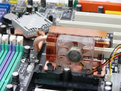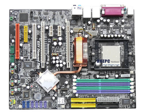 图为MSI提供的nForce 4 SLi X16 AMD Edition的样本型号为K8N Diamond Plus,和上代K8N Diamond比较除了加入双SLi X16绘图接口外,还首次在主机板上采用HeatPipe散热技术,南桥CK804的热力会被导向C51D晶片组上方的全铜鳍片上,而风扇则对著显示卡核心的后方位置,同时为显示卡散热,特别是一些后方有大型散热片的Heatpipe显示卡,散热效果更为显著。