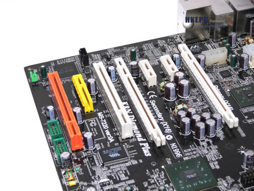 除了主机板上两组PCI-E X16绘图接口外,K8N Diamond Plus还提供了一条黄色的PCI-E x2绘图接口,但可以看到接口的未端是有缺口的,因此可多接上一片PCI-E x16显示卡达成6显示输出,但却只能运作在PCI-E x2的500MB/s速度。另外K8N Diamond Plus中间的PCI-E X16接口其实是由CK804 nForcer 4 SLi提供的,因此它也可分拆为两组x8接口,可支援类似Gigabyte 3D1的Dual GPU显示卡。