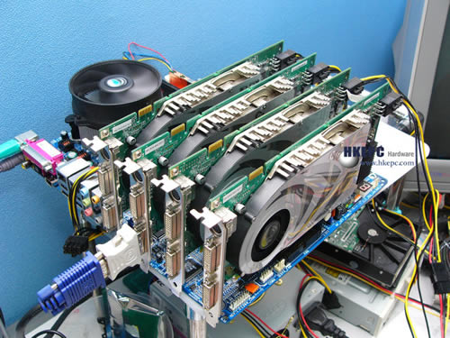 我们把4片Geforce 7800GTX显示卡放置在Gigabyte GA-8N-SLi-QUAL-Royal,初时在使用上常出问题,当驱动程式在安装时会出现重新启动,原来是我们的Delta ServerPower 550W也不能同一时间推动Pentium 4 3.73GHz + 4片Geforce 7800GTX,及后我们需要用两颗电源供应器才可运作正常,并成功在作业系统中认出四张Geforce 7800GTX。