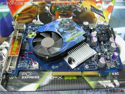 这款显佧采用了深蓝色的PCB板卡设计,搭配标准的公版散热器,桥接芯片也覆盖上单独的散热片。显存方面,它采用了三星2.0ns GDDR3显存颗粒,由全部在正面共4颗这样的显存组成了128MB容量和128bit位宽的显存系统。它的默认核心频率为500MHz,显存频率为1100MHz。