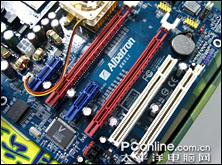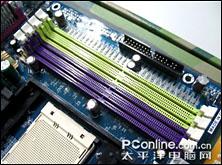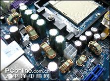 从供电电路和电容我们就可以看到这块主板的设计用料是非常扎实的,主板内建4条DDR400双通道内存插槽,支持4G的内存容量上限,完全能够满足用户的使用和以后升级需要。