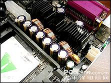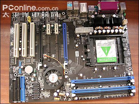 标准ATX大板设计,纯黑色PCB质感一流,采用增强三相供电设计,搭配2200uf红宝石MBZ系列电容,并为MOS管设计了专用黑色散热片;主板提供了4条DIMM插槽,可支持最多4GB的双通道DDR400内存。内存部分采用了独立供电,这样充足的功率完全可以满足超频的需要。