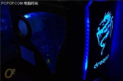 安装完成以后,终于可以运行了,首先展示的是夜间效果,前面板的蓝光给人一种很神秘的感觉,而面板的边框发光刚好成为龙图标的框架,配合的感觉很好。内部风扇的灯也从旁边的窗口透出来,交相辉映,煞是好看。