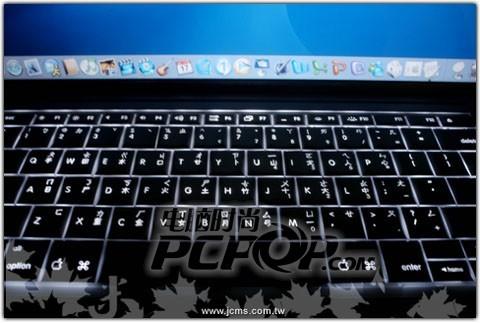 如上图,是在黑暗情况下完全点亮后键盘的样子。怎么样,是不是非常炫的键盘!苹果的这种键盘灯采用一种半透明设计,会针对现场环境光源调暗本本的屏幕,然后把键盘亮起来,设计得非常贴心。