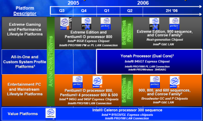 大家从上图中可以看到,Intel为自己的桌面处理器制定了四个阶梯,最低的当然还是赛扬D,也就窍衷诘?xx系列,其次是P4 5xx、600x和PD 8xx,而到了明年下半年,这一定位的处理器将会被P4 6xx和PD 8xx、9xx(65 nm Presler 核心,外加2MB L2 缓存,于2006年第一季度推出),所取代,到了明年我们也许就再也看到到5xx系列的身影了。