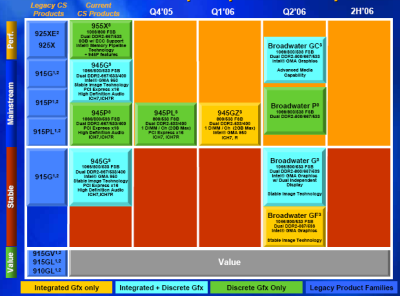 Intel一贯的做法,处理器一变,芯片组肯定要随之改变。这不上图中明确标出了到05年第四季度,915PL和915GL将肯定停产,取而代之的是目前高端的945P芯片组。