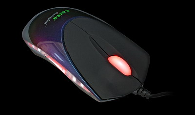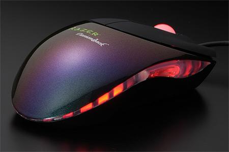 这款鼠标别具个性的是十左右两个按键的设计,并不是一体式设计,但长度很长,两个按键的前端中央有明显的凹陷处,两侧则微微翘起,为食指和中指的存在提供了恰到好处的空间,如此的人体工学设计,Diamondback做得还很细致。鼠标的周围有一圈透明的胶质防滑带,这条防滑带在你手握鼠标的时候不仅可以提供防滑的功能,而且,在鼠标工作的时候,会有幽幽的红光从中透出。