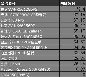 本项测试所用的DEMO是笔者录制的一段真实游戏片段,里面包含大量的对战及爆炸场面,能反映游戏耗费内存资源时的情况。测试结果与《FarCry》相近,但差距已缩小,最快和最慢的特别版显示卡差距在6帧以内。那么,256MB显存是否有用呢?除了技嘉GF6600 256MB显卡排名第四外,其余256MB显存的显卡型号的成绩都不太理想。原因何在?原来,BF2是一款极其消耗内存的游戏,而128MB特别版显卡的工作频率高出256MB显存版显卡很多,足以弥补显存容量上的损失,所以还是选择128MB显存的特别版显卡更合适。