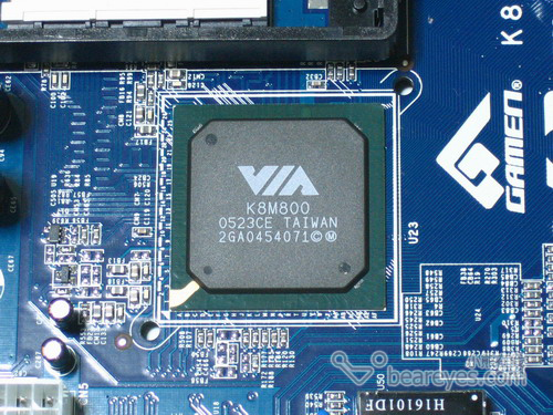 主板的北桥部分采用了VIA的K8M800芯片组,主要负责AGP的控制,该芯片集成了VIA的S3 UniChrome Pro图形处理芯片,在视频方面增加了一些新的功能,比如集成了MPEG-2硬件加速功能,2个扫描管线,具有200MHz的速度,128位2D/3D引擎。对于一般应用和简单2D/3D游戏来说绰绰有余。