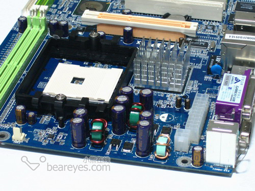 主板采用比较简单的两相供电方案,配合台系OST直立式电解电容,虽然这样的供电部分略显单薄,但对于日常的稳定工作是没有问题的,同时,它使用了一个传统20pin电源接口和一个4pin12V接口对主板进行供电。