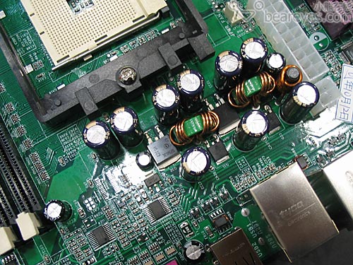 供电方面,这款主板只采用了略显单薄的两相回路供电设计,并辅以多颗大容量的OST直立式电解电容,以保证主板日后工作的稳定性。