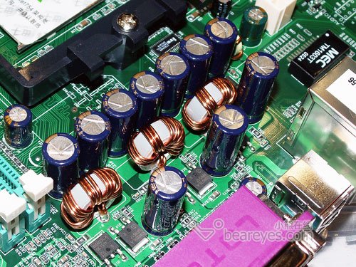 这款C.NF4X主板在供电部分采用三相供电电路,搭配日系高品质2200uf红宝石MBZ系列电容和优质电感。对于这个价位主板来说,相当奢华了!