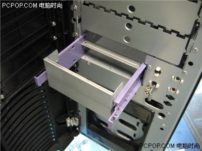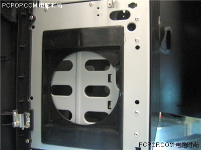 进一步剖析前面板,我们可以把那ABS工程塑料完全打开,露出钢结构机箱架。从这,我们可以清晰的看到,该机箱拥有5个光驱位,两个3.5寸软驱位。在软驱的下方,还有个12CM的机箱风扇位,这可以和机箱后部的机箱风扇组合形成风道。