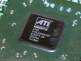 这片Asus AX700-X采用了RV410显示核心,拥有8条流水线及6个Vertex引擎,虽然此卡外表有点丑陋,但其规格却和其他Radeon X700普通版完全看齐,核心时脉为400MHz,记忆体方面采用-4ns Hynix GDDR TSOP颗粒合共128MB,频宽为128Bit时脉则为500MHz。