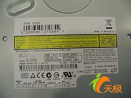 光驱背部留有产品的铭牌,标注了生产日期:2005年10月,产地:马来西亚。