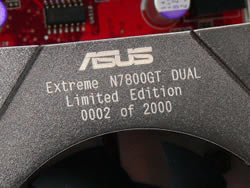 虽然双晶片显示卡已经不是什么新鲜事,但笔者还是被这片怪物所吸引,Asus Extreme N7800GT Dual的体积上代大幅度缩减少至25cm(W) x 13cm(H),虽然相比Gigabyte 3D1-68GT的25.5cm(W) x 10cm(H)略为巨大,但已经可以放置于一般Full Size ATX机箱内。在散热器表面写著Extreme N7800GT Dual Limited Edition 0002 of 2000,全因Asus宣称不会大量生产这片怪物,只会制作2000片限量发售及作媒体评测,并会著明是全球第几片,给媒体评测的版本更会入"for media review only"的字眼。