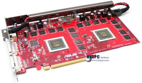打开散热器后,我们可以看到Asus Extreme N7800GT Dual的真身,它的PCB设计是经过重新Layout而不像上代Extreme N6800Ultra Dual只是单纯把两片Geforce 6800Ultra公版Layout放在同一PCB上,在规格上Asus Extreme N7800GT Dual是40 Pixel Shader Pipeline及14 Vertex Shader Engine,并拥有512Bit记忆体频宽,这些数字都是把两颗Geforce 7800GT核心加在一起而已,Asus把7800GT核心时脉由官方400MHz提升至475MHz,而记忆体则用上Samsing -1.6ns GDDR3颗粒,更预计超频至1260MHz,令Asus Extreme N7800GT Dual的效能相比Geforce 7800GTX SLi还是强劲。