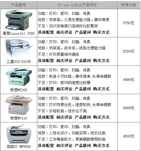 首先为你介绍的第一款是惠普(HP)的LaserJet3380,它最大的特点是综合性能高。扫描单元顶部配备了ADF自动进纸器,可一次性对50页纸张进行连续的输入,可以实现多页传真、多页复印、多页扫描。在打印和复印速度方面,均达到了每分钟20页,是一个很理想的速度。与现在主流的扫描仪相比,它具有600dpi×600dpi的扫描分辨率,略低于主流的扫描分辨率,但也足以完成日常的办公扫描任务。另外,无论是它控制面板的按键还是路线接口的设计都十分合理,简单明了,易于操作。如果你对打印、复印速度要求较高,又要求扫描、传真性能跟得上的话,惠普这款LaserJet3380是不错的选择。