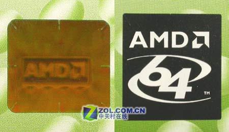 为了区别老款32位闪龙处理器,总代理还在产品外包装盒的右下角醒目的粘贴了一张黑色的“AMD 64”标签。激光防伪标志中间印有象征着处理器核心的图案,图案上标明了AMD字样。