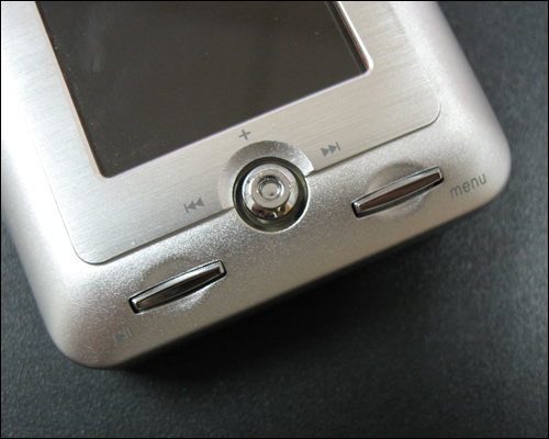 机身正面设计有五维摇杆和两个细长按键,分别担负着歌曲开始暂停、前进、后退及音量调节等基本功能的调节。按键的灵敏度不俗,但面积较小,对于手指稍大的人来说操作可能有些不便。