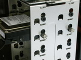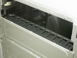“海啸”机箱虽然在体积上比Tt以往的机箱小了些,但在内部容量上却丝毫不逊色。其最多可以同时容纳4个光驱、2个软驱和5块硬盘,之所以会有这么大的扩展空间全部要归功于内部的通底化设计。扩展板卡的卡槽设计上,“海啸”比起Xaser系列机箱有了较大改进,现在这种卡扣方式很好的避免了过高板卡无法使用的问题。在机箱侧面的底边上“海啸”预装了一个报警装置,不过要想让这个装置起到作用还要主板的支持。