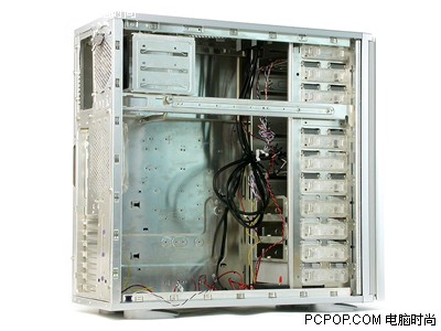 Kandalf除了令人震撼的外观和散热能力外,内部结构更是让人惊喜。在机箱前面板上共10个5.25”安装位,内置8个3.5”安装位,极为轻松的就可支持服务器系统使用,DIY用户的感受自然超凡脱俗。在机箱面板的最下方,是一个抽屉式5.25”的零件盒,方便DIY用户一些日常工具的存放,后置抽取式硬盘装置槽让硬盘的安装更加方便,散热更加有效。同时Kandalf系列机箱还可以通过BTX升级套件,能同时兼容ATX和BTX的架构,为日后升级做足准备。