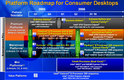 Intel于IDF秋季论坛上已透露,它们将会在2006年于桌面平台上作出大幅的改动,在2006年Q1将会推出全新65奈米的处理器,包括Presler双核心的Pentium XE 955及Pentium D 9xx系列、Cedar Mill单核心的Pentium 6xx及用于迷你平台的Yonah双核心Pentium M,由于新一代65奈米制程大幅地减少漏电情况高达一千倍,令处理器的功耗和热量相比上代90奈米制程大大减少,Intel 65nm奈米制程其Gate Length已达35nm,而且Gate Capacitance亦只有1.2nm,较低的Gate Capacitance 能减少能源消耗及增加电子开关的时间及准确性,改用第二代的矽晶体及采用NiSi低电阻物料,令65奈米制程比上代90奈米功耗减少最高达30%以上。