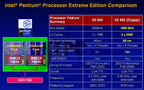 新一代65奈米制程的处理器将可全面过渡至旧有的i955X/i945系列晶片组平台,唯独是65奈米的Pentium XE不可以用回旧有的晶片组。新一代Presler双核心同样为分Pentium D和XE版本,但不再像上代Smithfield般只有Hyper-Threading支援上的分别,Presler核心由上代2 x 1MB L2 Cache提升至2 x 2MB L2 Cache,同时更可提升至1066MHz FSB,并支援Intel最新倡议的Intel Virtualization Technology,不过1066MHz FSB只会出现于Pentium XE上,Presler的Pentum D还是保持800MHz FSB。