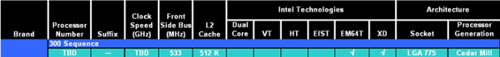 主流级市场上,06年Q1同样会导入65奈米,核心代号为Cedar Mill的Pentium 4,其规格和Prescott 2MB完全相同,支援800MHz FSB外频并内建2MB L2 Cache,由于新一代65奈米制程大幅地减少漏电情况高达一千倍,令处理器的功耗和热量相比上代减少接近30%,解决Prescott一向被垢病的热量问题。低阶Celeron处理器方面,Intel并没有打算在2006年Q1导入65奈米,不过在发展蓝图中已有65奈米Celeron的存在,同样是Cedar Mill核心,外频还是保持在533MHz,但L2 Cache却由256KB增至512KB,支援EM64T及XD功能。