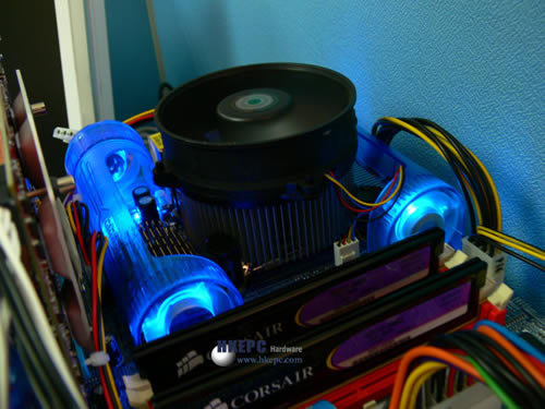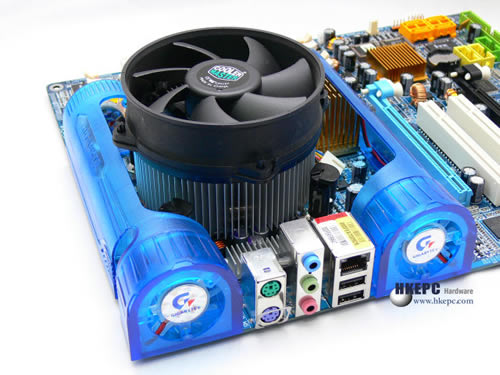 运作时由于风扇会发出蓝光并透射到整个风管道,十分型酷。我们内部测试显示,对比使用了G1-Turbojet前后,供电模组及北桥温度有相差10c/20c之上,证明Gigabyte在主机板散热方面下了不少苦功,同时提高了主机板的超频能力。