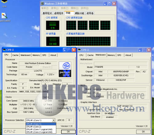 AsRock果然没有令我们失望,我们把这颗Pentium XE 955处理器放进Asrock 775i65PE主机板上,它是一片经AsRock改造的865PE主机板,不单可支援Pentium D及Pentium XE还追加1066MHz FSB,连i945晶片组都未能及得上它的规格,结果还是正确无误地把这颗连i955X都不能跑的Pentium XE 955驯服了,这亦代表i955X不支援Pentuum XE 955非不能也,实不为也。