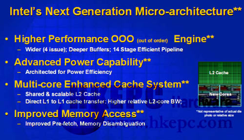 2006年Q1 Intel正式导入65奈米制程,所推出的Presler双核心处理器很可能是短命种,因为Intel说过他们会进行处理器架构改革,放弃以高Pipeline Stage高时脉为主NetBurst架构,采用较接近Pentuum M Banias的低功耗高效率设计,但却会保留FSB Bus、EM64T等功能,就是2006年下半年度Intel重头戏Conroe核心,它只有14 Pipeline Stage、双核心能共用L2 Cache以减少使用FSB作交换,直接的L1与L1资料交换,更加强了Pre-fetch及Memory Disambiguation能力,这才是Intel真正的双核心,Presler的出现给人的感觉只是过渡性质,没有太大惊喜。
