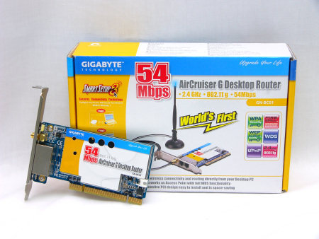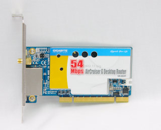 现时无线网络已经十分普及,而Gigabtyte有见及此推出了全球首片PCI接口的无线路由器,其支援IEEE 802.11b/g规格,最高支援54MBps速度,并具有全功能的IP分享器的功能。在功能上它可以说和传统的路由器相同,具有防火墙功能,并支援WPA 64/128Bit加密,让别人无法偷取你的资料。