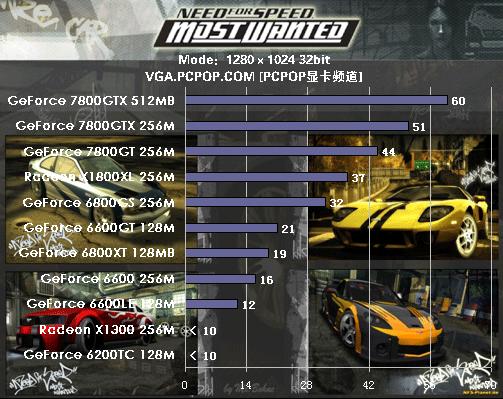 1280×1024分辨率是17寸LCD的标准分辨率,可要想在1280×1024下流畅运行《极品飞车9》就并非易事了。从测试成绩可以看到,只有6800GS以上档次显卡测试成绩在30 FPS以上,不过顶级的7800GTX 512MB测试成绩仍保持在60 FPS以上。