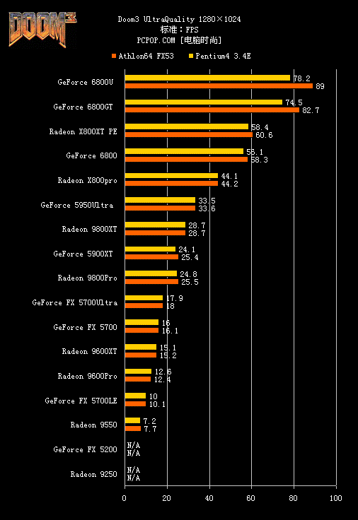 1280等比分辨率的情况与前面的测试相同,6800Ultra与6800GT遥遥领先,同时Intel与AMD平台间的差距也被拉的更大了。