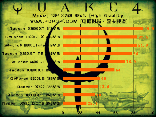 PCI-E显卡测试部分,我们新加入了ATI X1800XT、X1300XT以及X1300Pro进行对比。Quake 4的测试结果也比较出乎小编意料,在一贯是N卡占优的OpenGL性能测试中,ATI X1800XT竟然力压GF7800GTX。大家也注意到,7800GTX与6800Ultra的性能十分接近,可见1024×768分辨率下7800GTX性能没有得到最好的发挥。