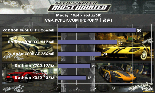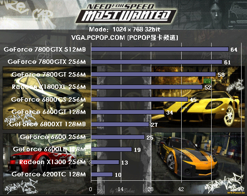 支持SM 3.0的显卡当中,NVIDIA近期发布的高端7800GTX 512MB无疑最为抢眼,在1024×768,特效全开模式(NO AA)中测试成绩有64 FPS,领先7800GTX 256和7800GT;在比较关注的ATI 7800GT与X1800XL对比中,NV稍占优势。此外我们也注意到,66GT测试成绩非常不错,500/1000MHz的高频率领先同是8管线的6800XT。