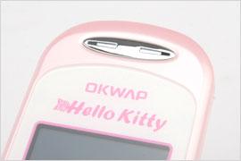 完全仿照于HelloKitty的粉红色的颜色主义,粉红色的主色调恰到好处地表现了HelloKitty的可爱和清新,可见HelloKitty完全是针对于女性所推出的一款机型,不然一位男士握在手中,你会想象他是如何可爱嘛?(偷笑ing...)精致小巧是对OKWAP HelloKitty手机的最佳写照,80×40×22.6mm(不含天线)的机身体积和80g的重量正符合女性对于手机的审美观,在机身上盖有一闪灯环,它可根据用户事先设定的闪动组合在来电和有信息时作出耀目而迷人的七色闪烁。HelloKitty手机主要是突出于在外观上的设计,而并没有展现功能上的强大,其配置上来说只属于入门级,分辨率为128×128像素65536色STN屏,而外屏的配置则是分辨率为96×64像素65K色STN屏,40和弦的双扬声器,500条的短信与500组的联系人存储空间,30万像素的摄像头以及一些实用性较强的工具都出现在了HelloKitty手机身上,不过里面HelloKitty图案的主题也是相当吸引人的一点。当然里面也有一项特殊的功能菜单,那就是“HelloKiyyt的秘密”,详细为用户介绍了关于HelloKitty的个人资料、爱好、家庭背景、家庭成员、朋友等资料,好让各位更深入和充分地了解和认识HelloKityy这位经典的卡通人物。另外,针对于年青女性对于星座运程的热爱,特别内置了“星座解说”、“星座生肖”、“星座速配”、“星座求职”、“星座网络情缘”、“星座美丽手册”,血型则包括四种主要血型的优缺点和相关特征,花语包括多种常见鲜花的寄语。