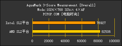 在AquaMark 3的测试中,AMD SLI平台获得领先,并超过Intel SLI平台5579分。