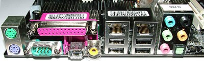 再来说说后面的接口,可以看到同时支持并口和串口,也支持SPDIF音频输入输出,两块千兆网卡(一块是Marvell芯片,另一块是nForce 4芯片),4个USB接口和一个火线接口。通过主板上的接线,可以支持额外6个USB接口和两个火线接口。